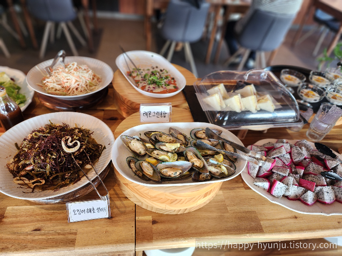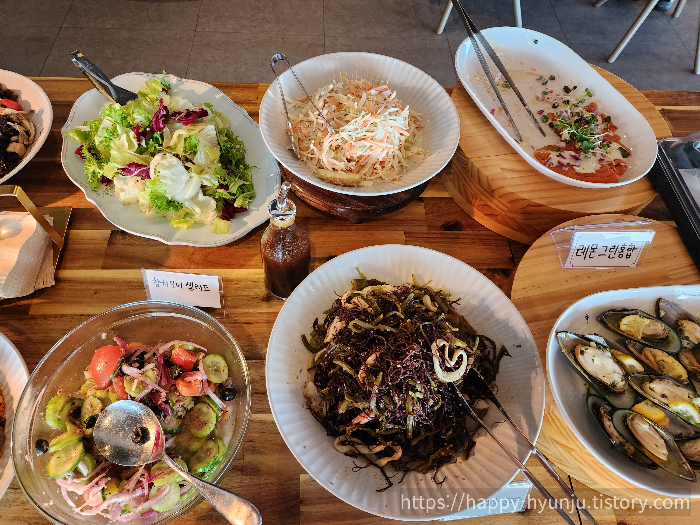 연어샐러드, 크래미샐러드, 해초오징어샐러드, 레몬 홍합구이