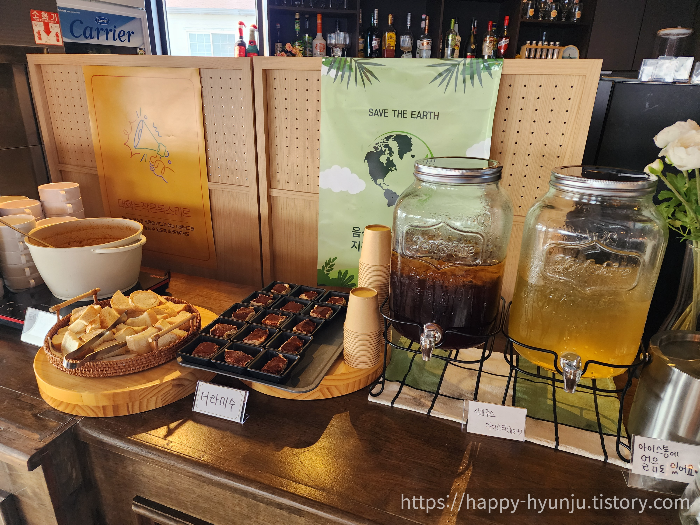 음료 쪽 코너를 살펴보면, 아이스티와 사과주스가 기본적으로 제공되고