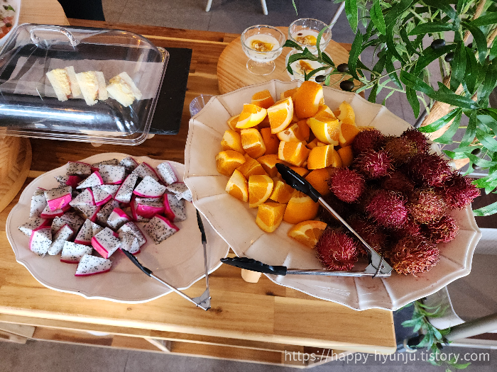 과일 2-3가지, 계란 샌드위치(수제), 망고 플레인 요구르트, 몇 가지 샐러드가 준비되어 있고