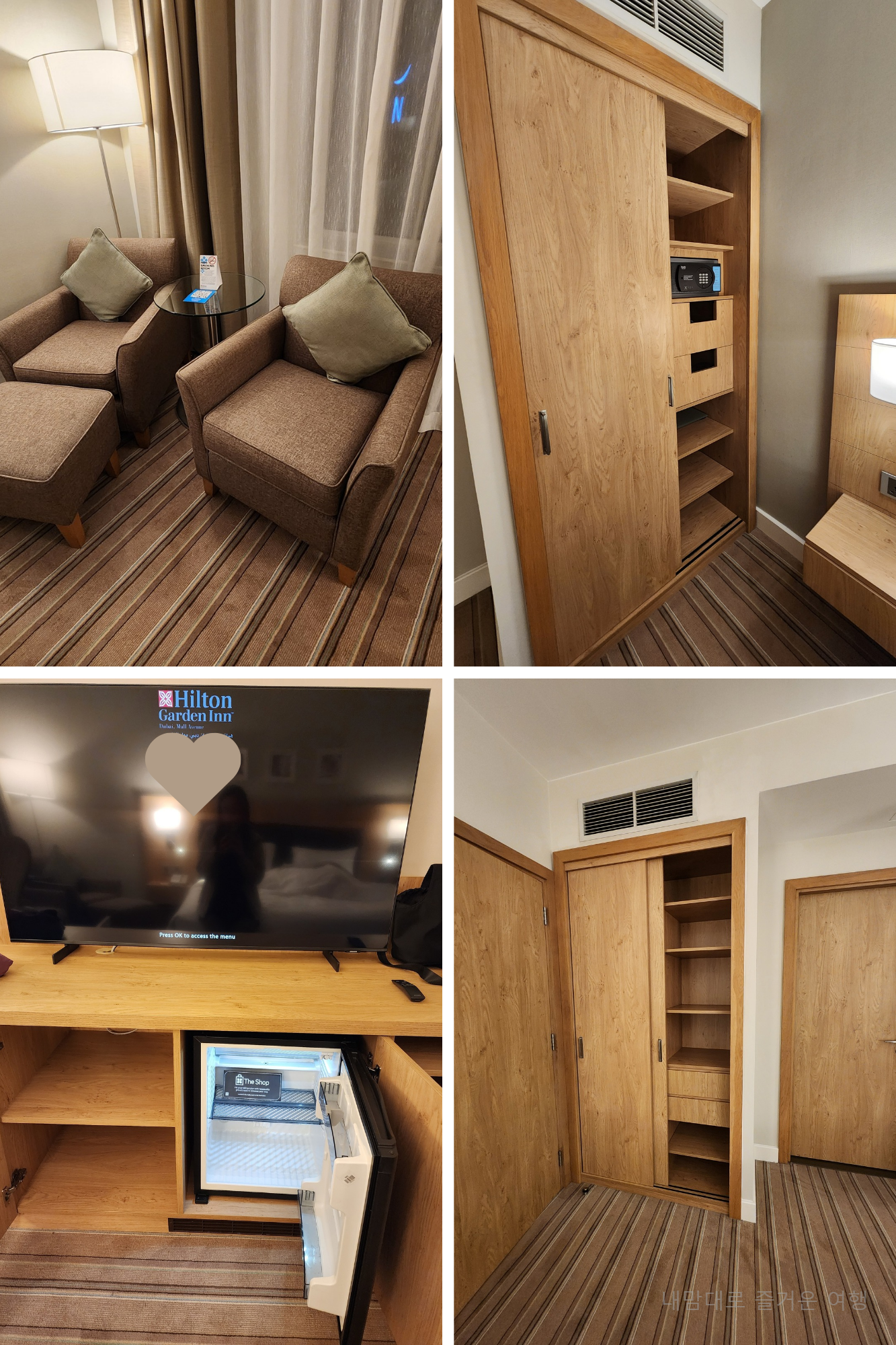 침대 오른쪽으로 쇼파가 있고 침대 맞은편으로 화장대와 TV가 있다. TV장 하부에 냉장고가 있는데