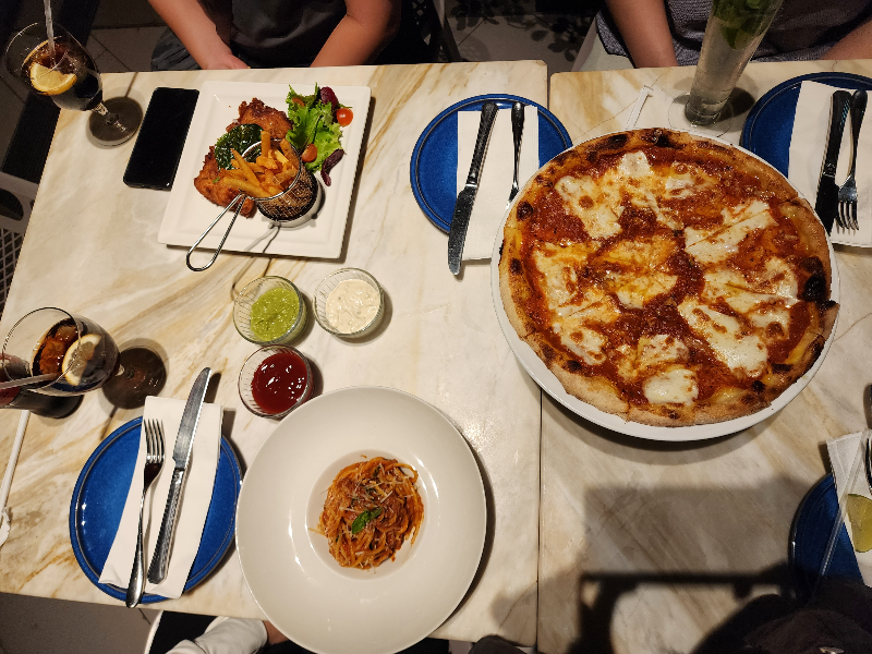 피자 하나, 피쉬앤 칩스, 파스타1개 시켜서 먹음. 음료먹고,, 대략 8~9만원 나왔음