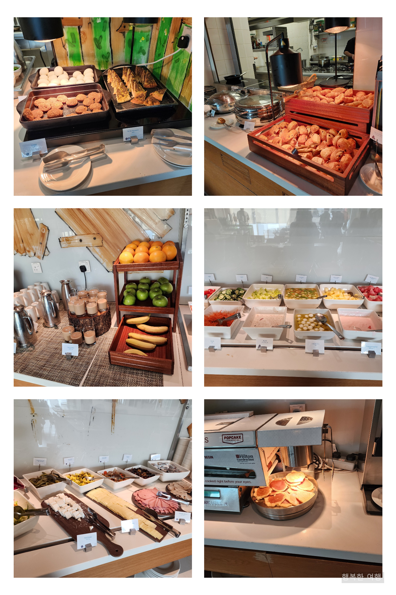 베이커리 몇 종류, 샐러드, 씨리얼, 과일, 삶은 계란, 팬케이크, 오믈렛 코너, 주스 코너가 있고