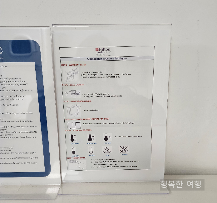 세탁기 2대, 건조기 2대가 설치되어 있어서 비어있는 기계를 이용하면 되고, 이용방법은 안내문이 붙어있다.
