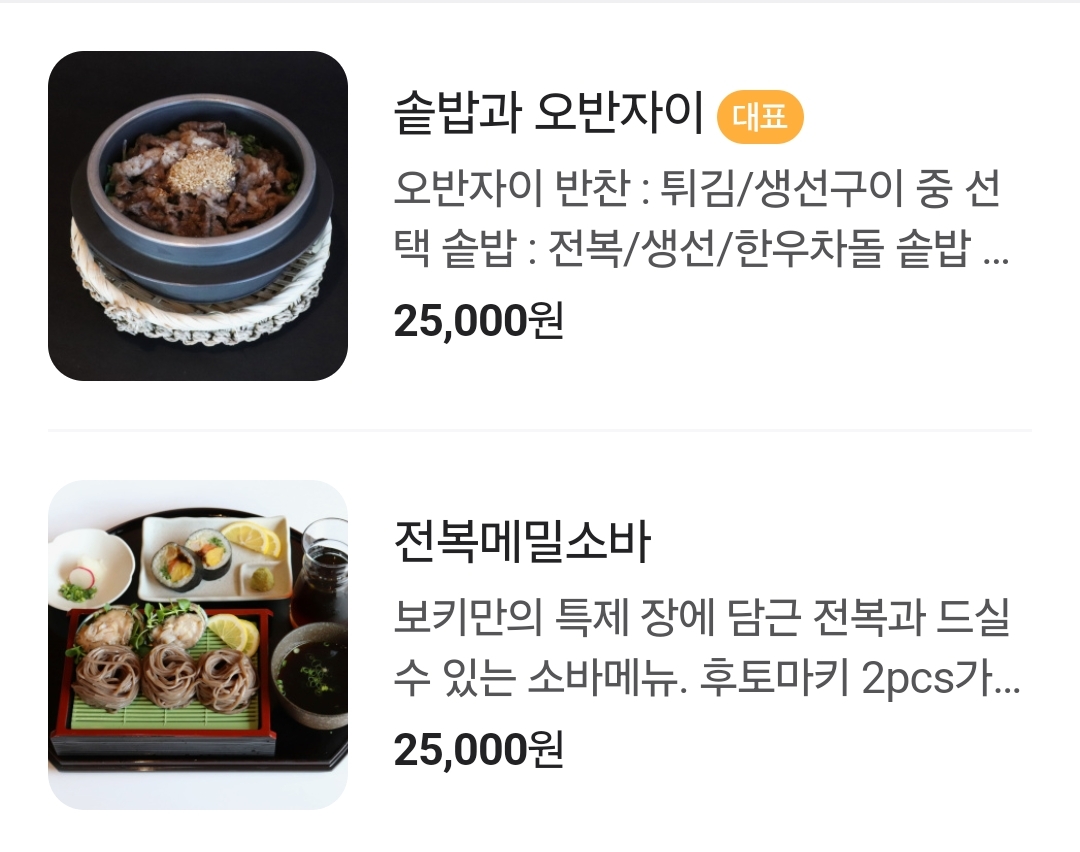 내가 갔을 때 전복 메밀소바를 드시는 분은 못 봤다. 여름이 아니라 그런가... 일단 나는 솥밥을 추천