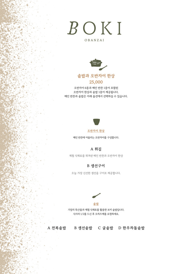 솥밥의 메인재료는 4가지 중 하나를 선택 가격은 솥밥정식 기준으로 25000원/인