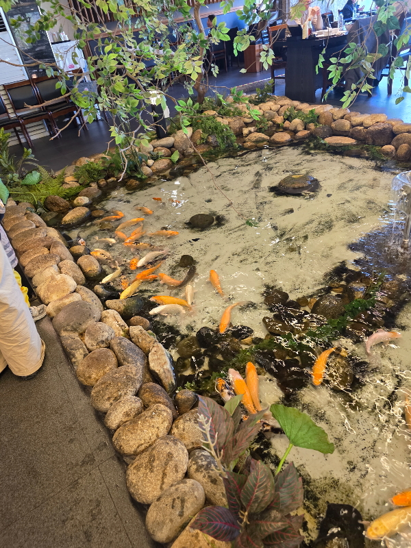 식당 내부에서 잉어가 돌아다니게 수로를 파두었고, 비단잉어 치어들도 직접 키운다