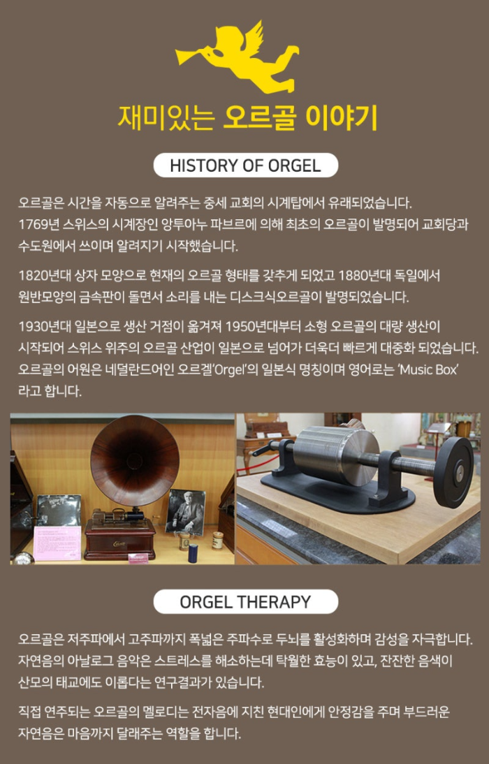 | 멀티미디어 경험 | 1층에는 벽면에 빔을 설치해 오르골 관련 영상을 상영 2층에는 전자 칠판을 통해 애니메이션과 함께 오르골 음악 감상 가능 |