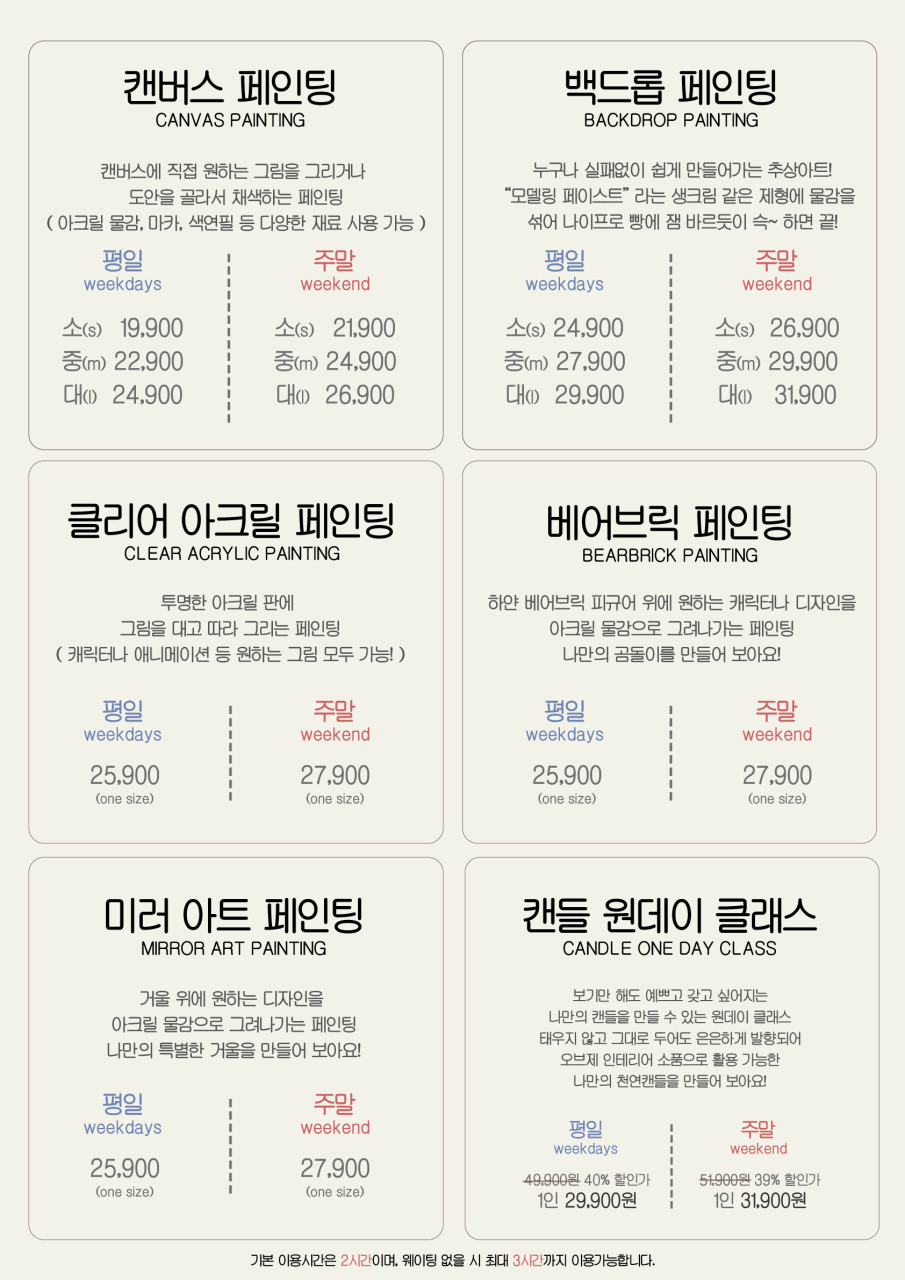 매장에 도착해서 어떤 걸 체험할지 고른 후, 캔버스 크기나 음료 선택에 따라 추가 요금을 지불하는 방식이다.