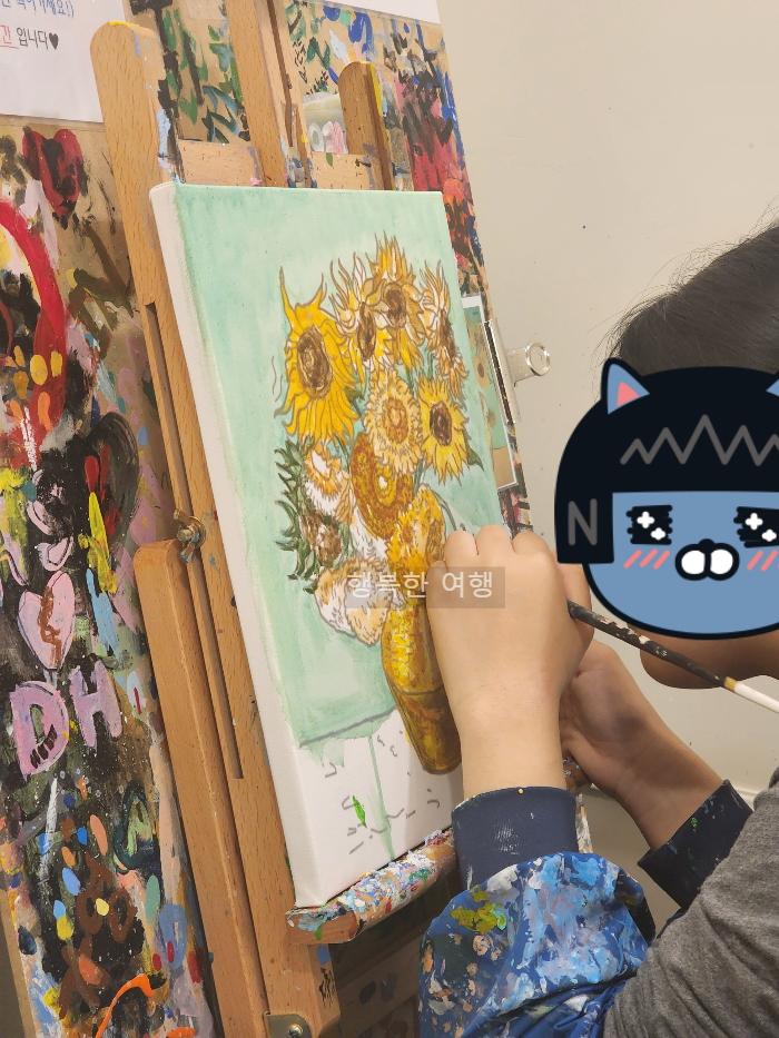 이제 색칠을 해 나가는데 나와 달리 색칠하기도 어려운 고흐 해바라기 명화를 선택한 우리 딸