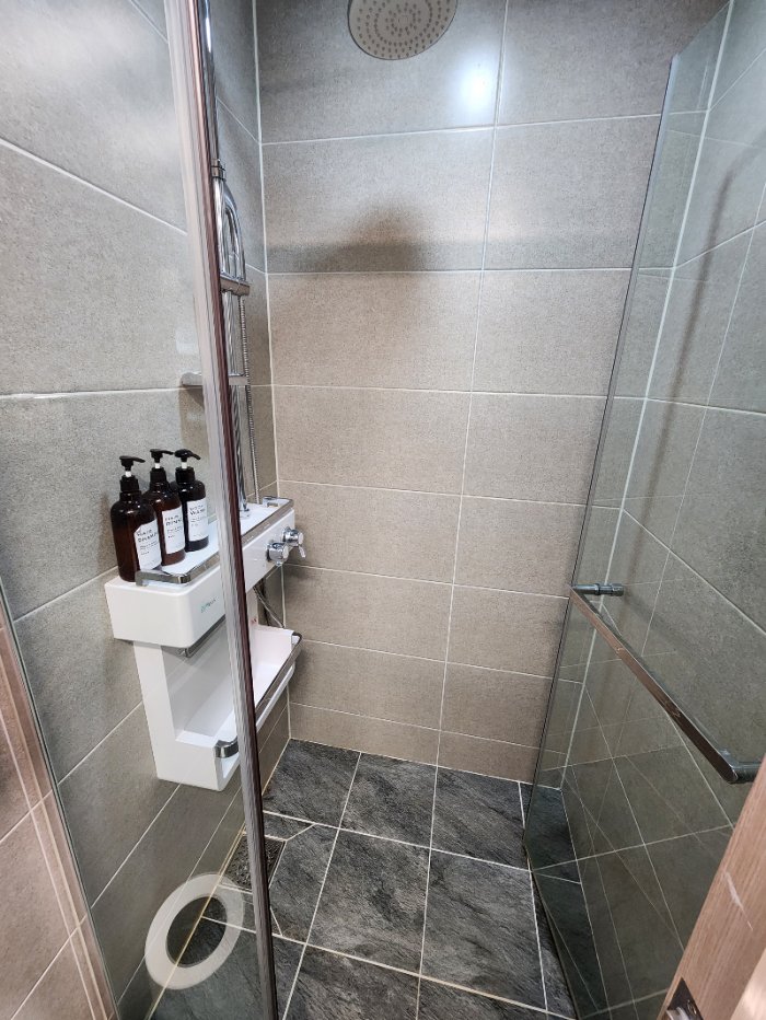 입구 쪽 오른쪽으로 욕실이 있는데 정말 깔끔하고 샤워부스 완비되어 있고 칫솔치약 없다.