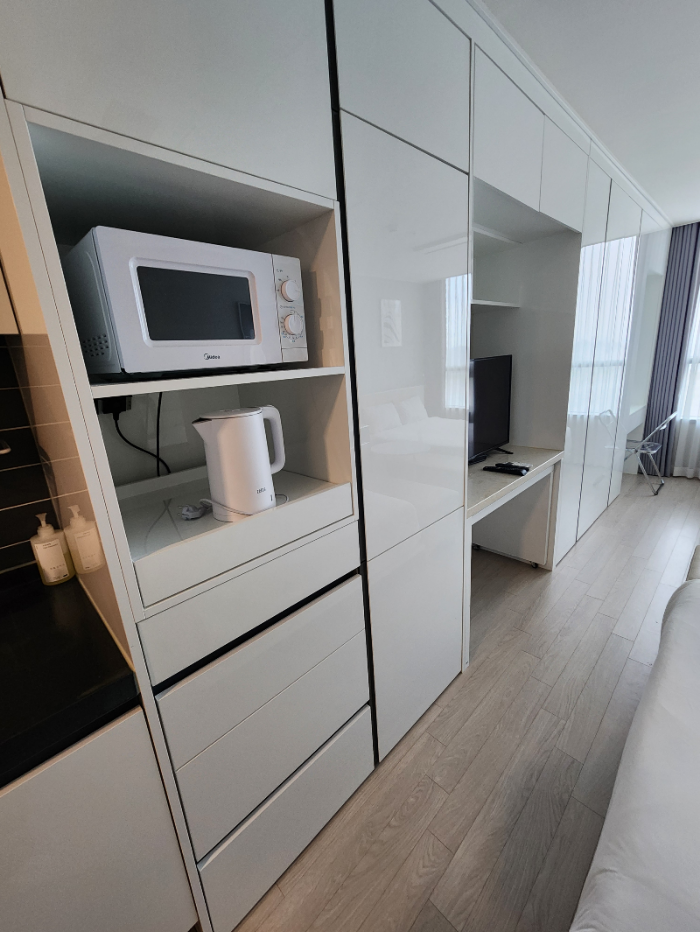 TV장 왼쪽으로 기다랗게 저게 전부다 냉장고다. 일반 호텔과 달리 레지던스라 그런지 정말 냉장고 사이즈가 좋다.