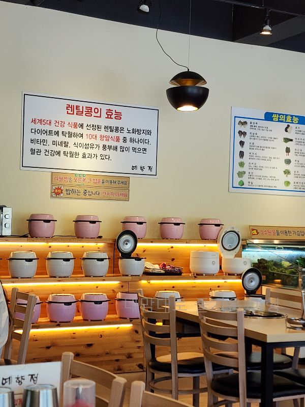 - 신선한 쌈 채소와 렌틸콩 밥 무한리필: 10가지 이상의 신선한 쌈 야채와 건강한 렌틸콩밥이 셀프 코너에서 무한 제공