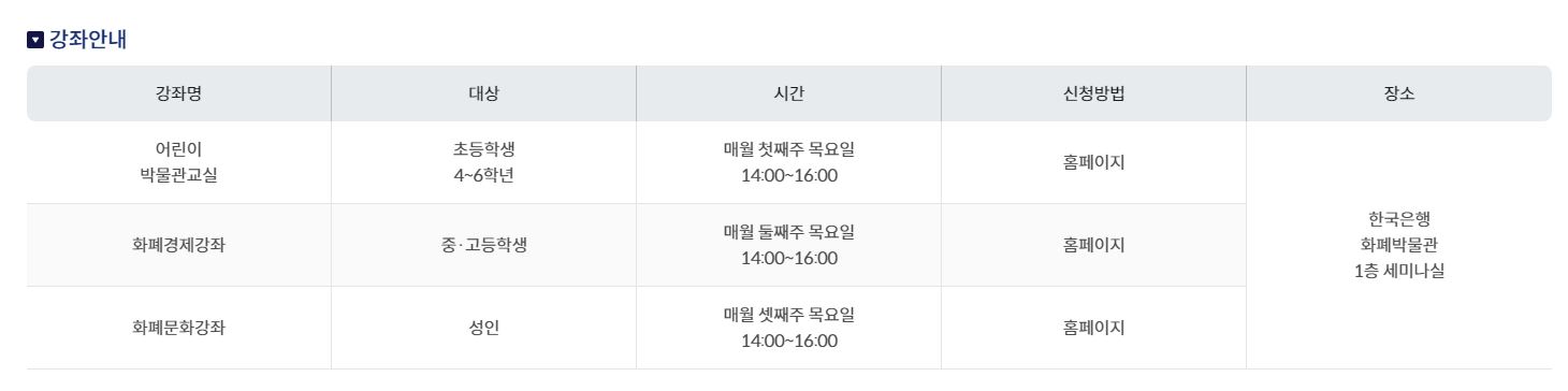 - 화폐문화강좌 : 일반인 및 대학생을 대상으로 화폐에 얽힌 역사, 문화 등의 인문강좌를 제공