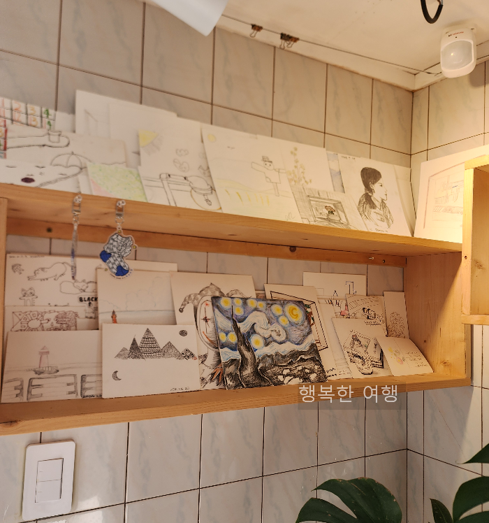 청사포 북청화첩 카페 한편에는 손님들이 그린 그림을 전시해 두는데,