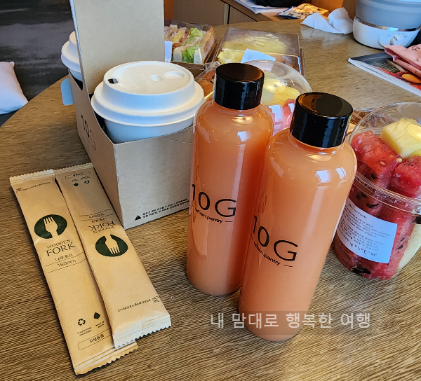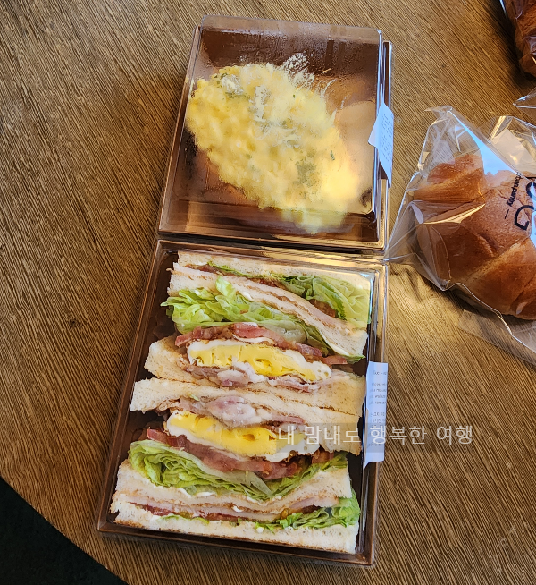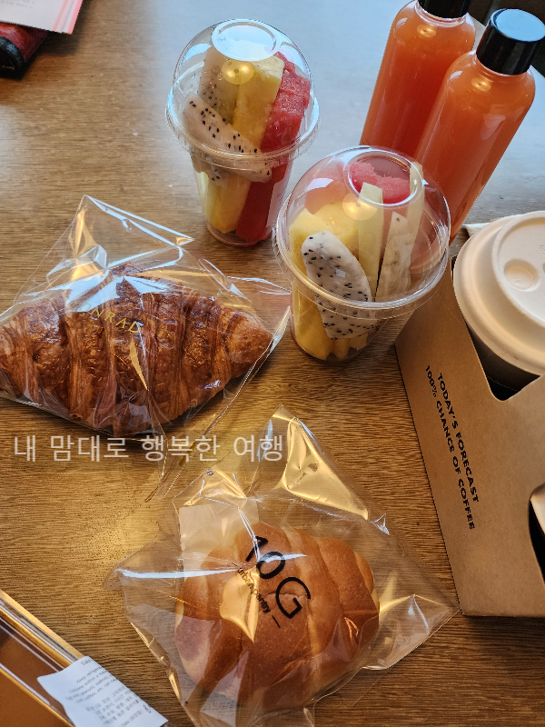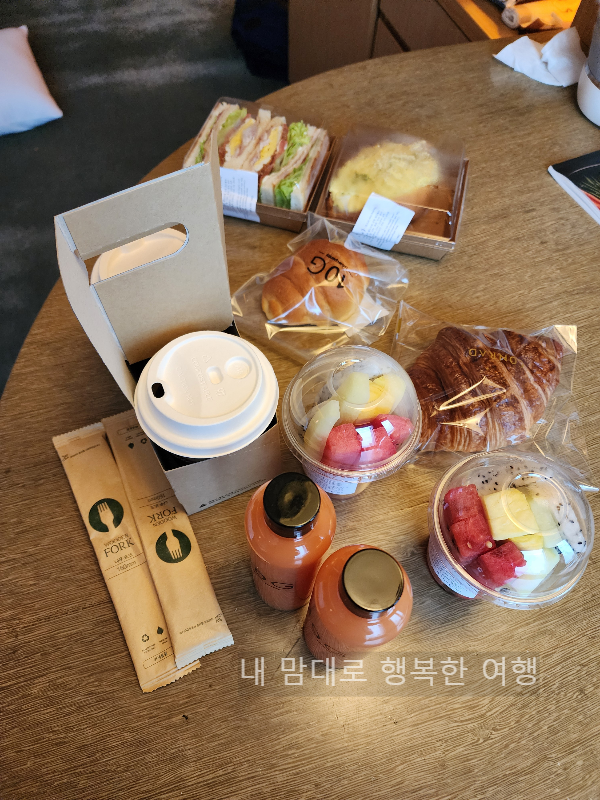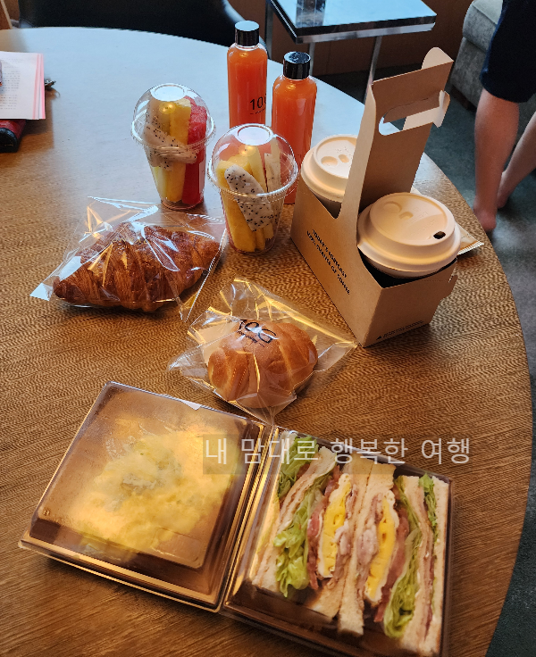 간편 조식 메뉴는 가지고 오거나 거기서 식사를 할 수 있었는데 나는 포장을 해와서 룸에서 나누어 먹었고