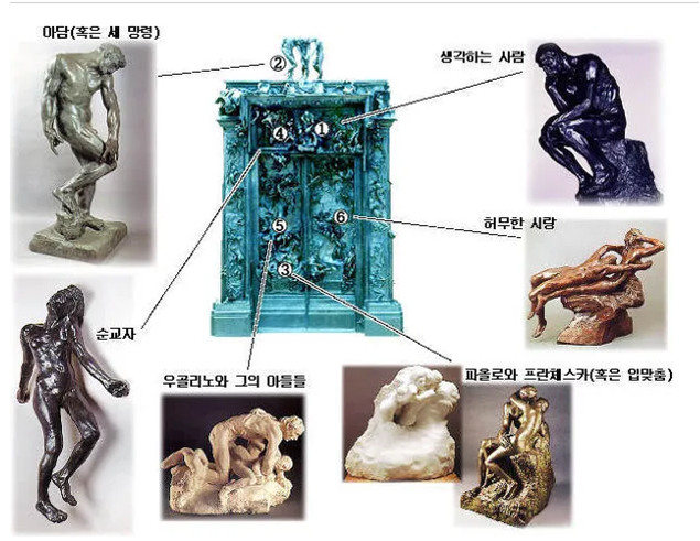 지옥의 문을 자세히 살펴보면 생각하는 사람, 세 망령들. 아담, 이브 조각상이 합쳐진 거대한 조각상으로