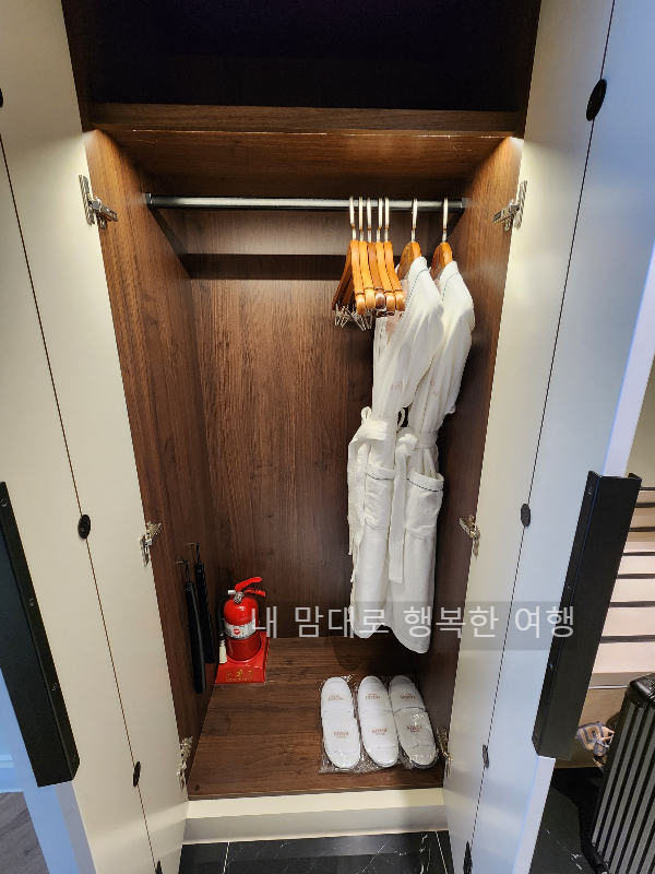 냉장고 옆쪽으로 가운이 걸린 옷장이 있다. 이곳에 서랍은 없고... 슬리퍼와 소화기가 구비되어 있다
