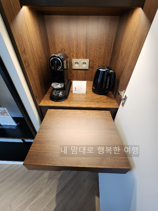 TV 오른쪽 옆으로 문을 열어보면 숨겨진 냉장고와 커피포트, 캡슐 커피머신이 준비되어 있고